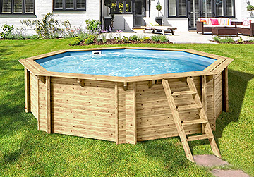 Die Holzpools aus unserer Premium-Reihe sind dank Ihrer besonderen Optik mit hochwertigem, natürlichem Kiefernholz ein echter Blickfang. Die Pools haben eine lange Lebensdauer und sind aufgrund der Imprägnierung der Holzbohlen sowie der UV-Stabilisierung und Frostbeständigkeit der verwendeten Folien widerstandsfähig gegenüber äußeren Einflüssen. Falls Sie ein Komplettset wünschen, können Sie im nächsten Schritt aus vielen Zubehörartikeln wie Leitern, Filteranlagen, Pumpenhäusern oder Wärmepumpen wählen.